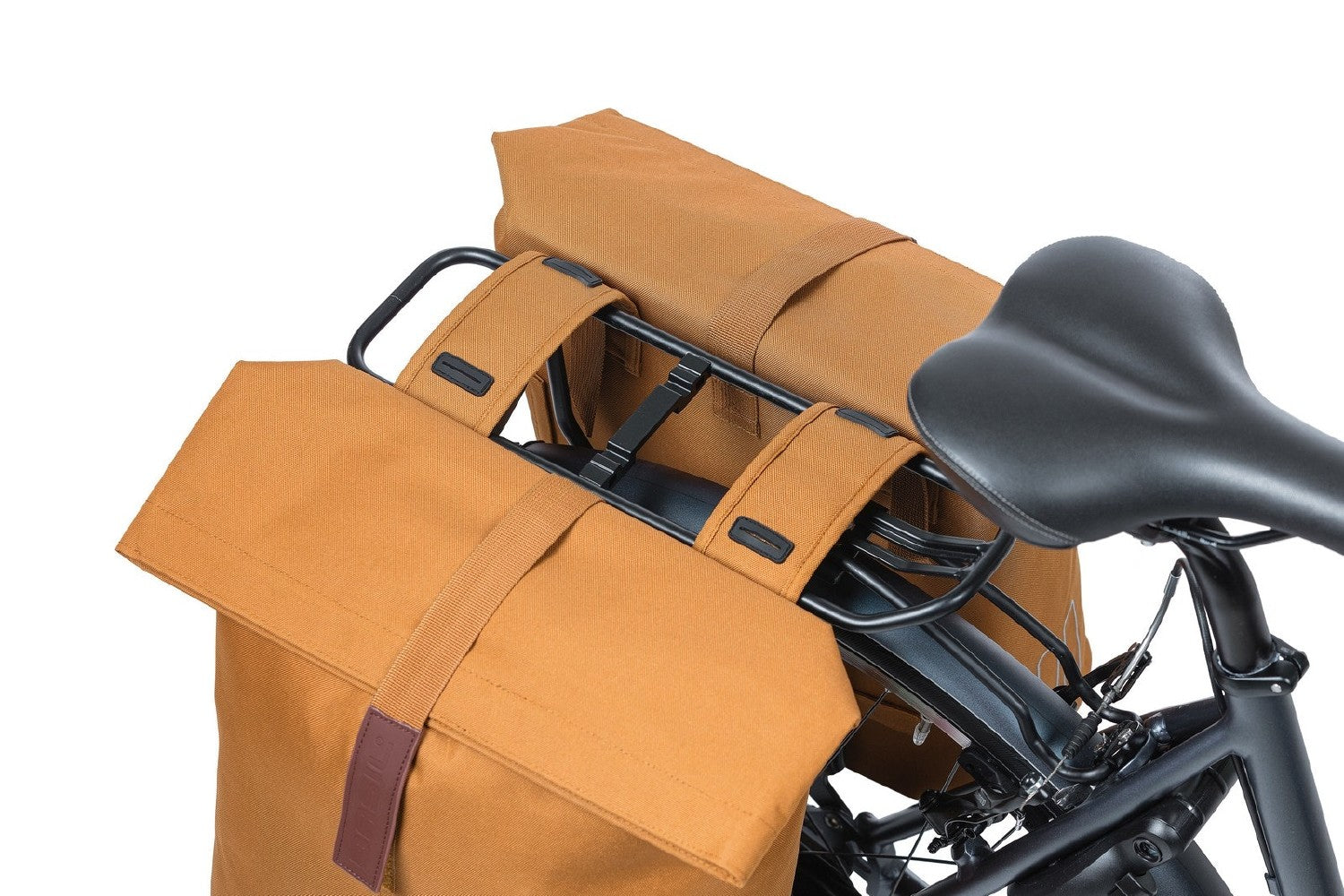 The Basil City double pannier is designed to perfectly complement the urban lifestyle – whether you’re commuting to work, meeting friends, going out, or doing some shopping at the market. Despite its compact size, the bag boasts a generous 28-litre capacity, which can be expanded to 32 litres if you need a little extra space. Adjusting the folding clasp with Velcro allows you to customize its height, ensuring a secure fit while also keeping rain at bay.