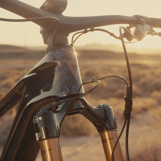 A proprietary carbon fiber layup and slimmer profile near the center of the handlebar adds compliance. This helps absorb shocks and vibrations, reducing arm pump and improving hand comfort on rugged terrain. Cables are routed through the headset for a clean look, and an additional frame port provides the option to add accessories such as lights.